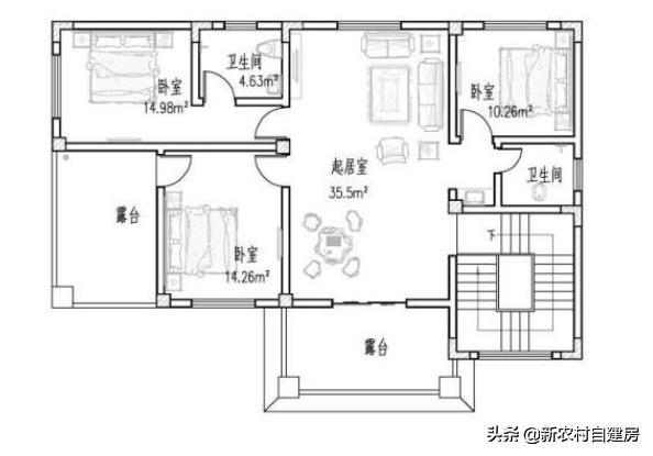 二層:起居室、臥室【附衛(wèi)生間】、臥室【附露臺(tái)】、臥室、衛(wèi)生間、露臺(tái)