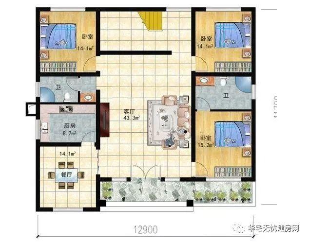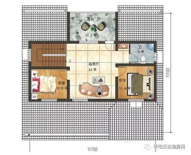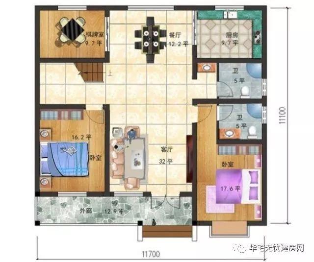 戶型設(shè)計尺寸:開間11.7米,進(jìn)深11.1米,建筑占地137.8平米,總建筑面積196.7平米。
