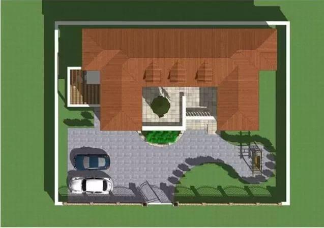 大開間的占地戶型,外觀提供兩種配色方案,底層用外墻墻磚,頂層用外墻真石漆,屋頂用深色蓋頂,顏色搭配合理;小院里設(shè)停車位、涼亭、休閑區(qū)和花圃,建筑頂層設(shè)露臺,設(shè)計非常的巧妙;建筑設(shè)計尺寸:開間22.6米,進(jìn)深10.6米;此設(shè)計最大的特點就是不僅做到了6開間均朝南,而且從平面上有凹凸,立面上有錯落 。