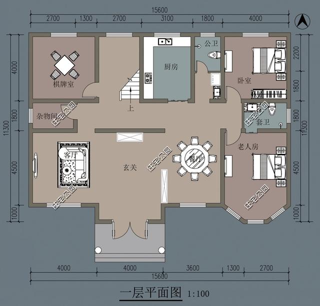 首層的玄關(guān)起著至關(guān)重要的作用,分別連通客廳、餐廳,棋牌室、廚房、公衛(wèi)等設(shè)計(jì)在采光條件較差的北側(cè)。