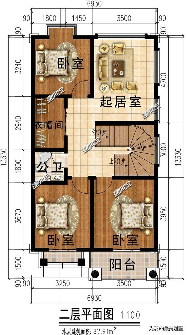 二層:起居室、3個(gè)臥室、衣帽間、洗手間、陽(yáng)臺(tái)