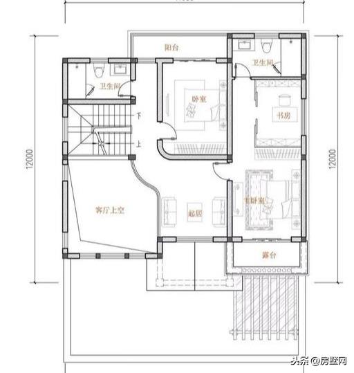 二層平面設(shè)計圖:起居室、臥室、衛(wèi)生間、書房、陽臺。