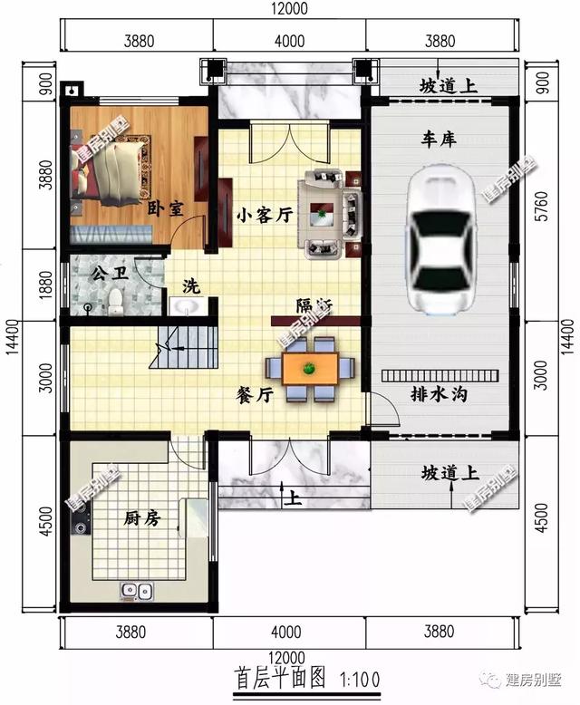一層布局圖:一室兩廳一廚一衛(wèi),客廳和餐廳處后期室內(nèi)裝修的時候稍做隔開,廚房往外凸出設(shè)計(jì),整體房型呈現(xiàn)一個L型,配有車庫很實(shí)用。