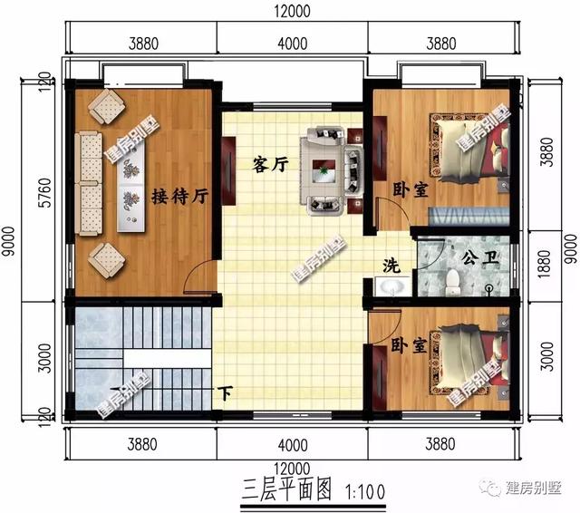 三層布局圖:兩室一廳一衛(wèi),一個接待廳(KTV、娛樂室或者茶室等均可)。