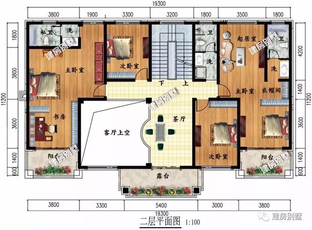 二層布局圖:四室一廳三衛(wèi),兩間主臥室均為套房設(shè)計,套房內(nèi)配衣帽間、書房、獨衛(wèi)和觀景陽臺,同時該層還單獨在茶廳外設(shè)有一個生活陽臺用于晾曬。