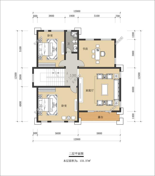 2層為3房1廳1衛(wèi),其中為2間臥室、1間書房和大空間的家庭廳,并帶有朝南露臺;