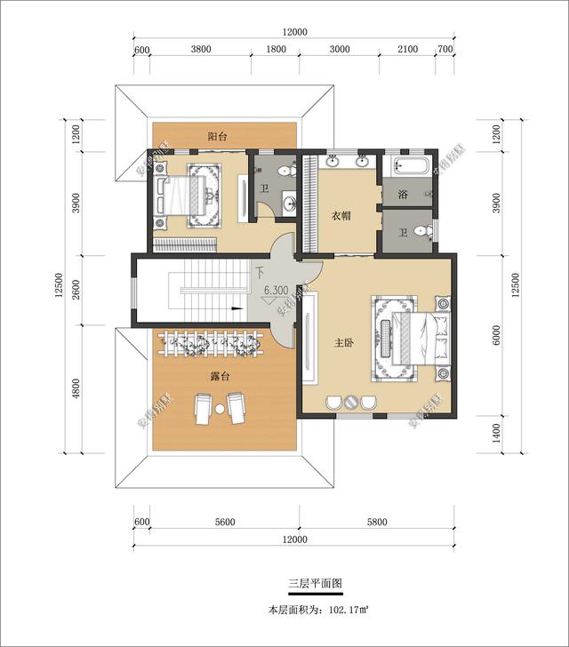 主臥放置在3層,私密性和景觀面相對都比較好,1間主臥套房和1間次臥套房,朝南的休閑大露臺;