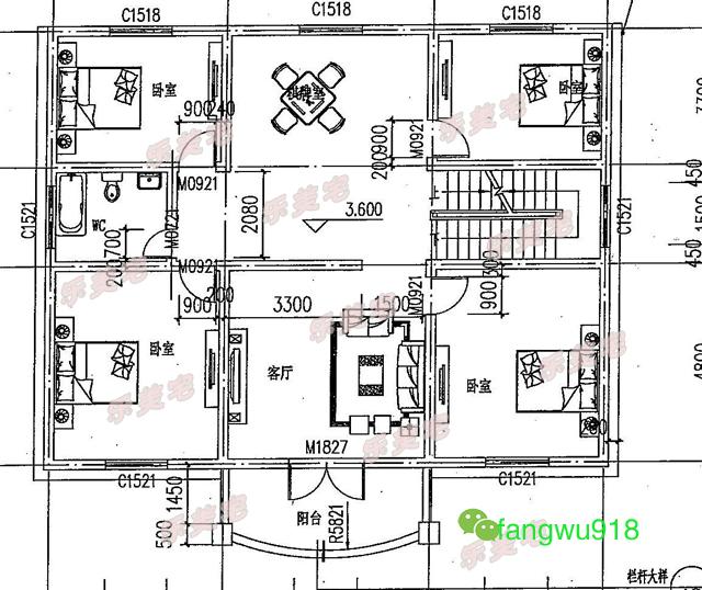 二樓中間以客廳和棋牌室為隔,左右兩邊分別為對稱的四間臥室,朝向合理。