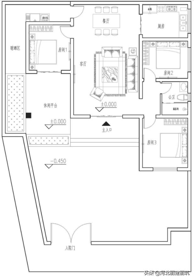 入戶正對(duì)空間沒有硬性格擋,通透大氣的客廳將東、西兩側(cè)房間聯(lián)系起來(lái)。室內(nèi)共三間臥室,西側(cè)房間與休閑平臺(tái)相鄰??紤]到鄉(xiāng)村生活,特別在西北角預(yù)留了晾曬區(qū)。廚房位于東北角,與餐廳相鄰。室內(nèi)空間較為開放,實(shí)用性很好。在西邊臥室的前面預(yù)留的休息平臺(tái)的活動(dòng)空間,家里的孩子可以到休閑平臺(tái)上玩耍。在朝南的臥室采光性好,可以留給老人使用。