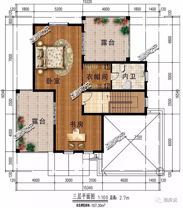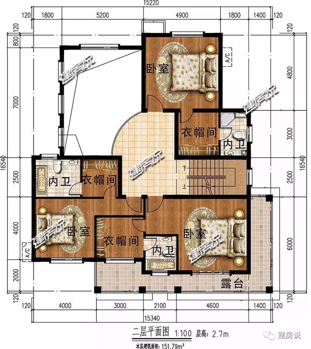 二層:設(shè)有3間臥室,大小適宜,每間都有衣帽間和衛(wèi)生間,能滿足基本需求;簡單的露臺,平常晾曬、采光沒有問題。