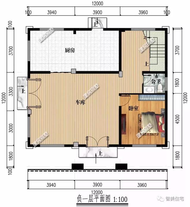 地下室布局圖:設計有一個寬敞的廚房、可供停放兩個車子的空間,一間備用的臥室和一個公衛(wèi)等。