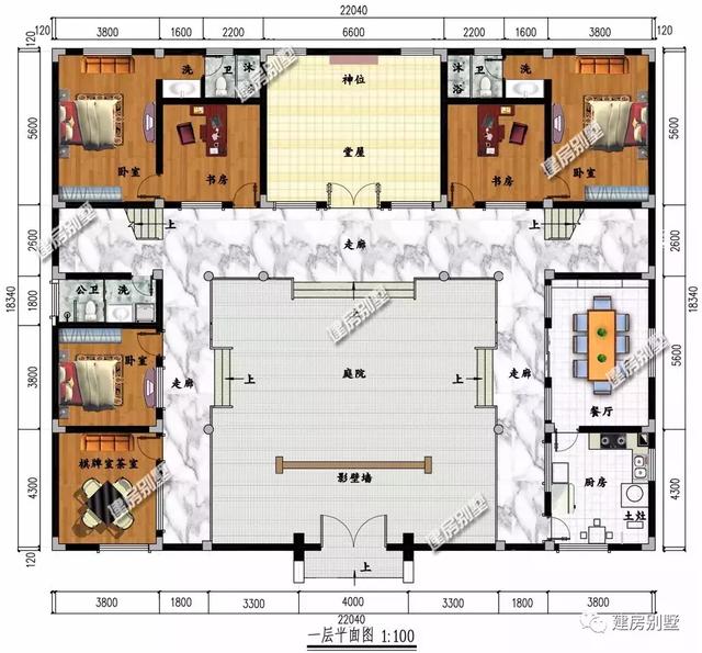 第二棟中式別墅:22.04×18.34米,面寬尺寸比第一棟別墅要大些,雖然都是合院別墅,但是在造型的布置上,還是有些區(qū)別的。