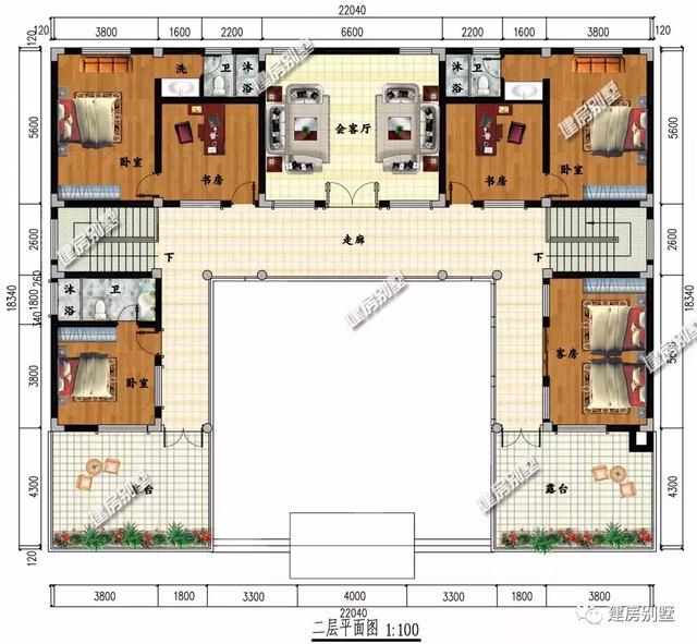 平面圖:一層設(shè)計(jì)有兩間主臥室套房和堂屋,每間臥室內(nèi)都設(shè)有衣帽間和獨(dú)立衛(wèi)生間,廂房功能有廚房、餐廳、客臥和休閑棋牌室等,入戶的地方做個(gè)影壁墻,避免開門見山;二層設(shè)計(jì)有四間臥室和一個(gè)會(huì)客廳,以及室外觀景晾曬走廊。