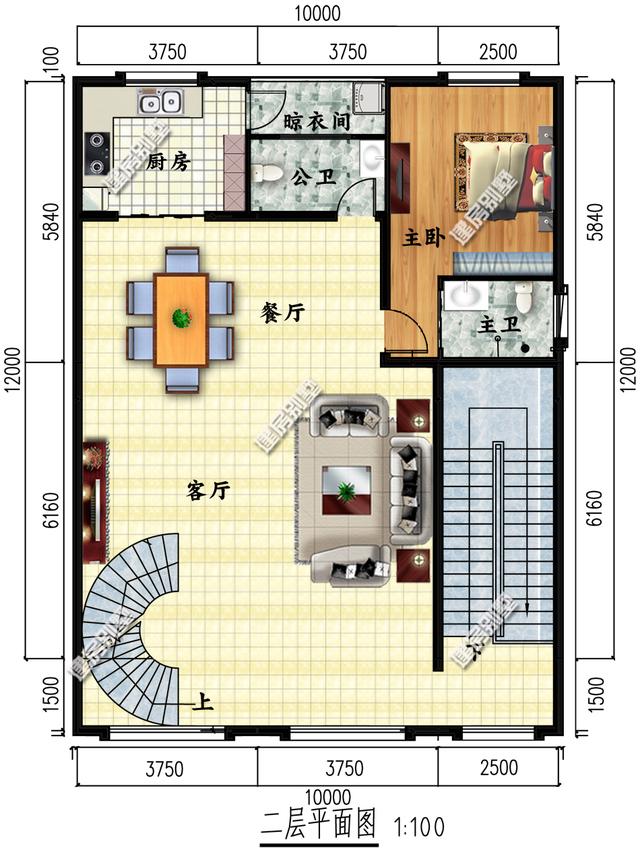二層高度3.2米,布局為:廚房、餐廳、客廳、公衛(wèi)、晾衣間、主臥+主衛(wèi)。