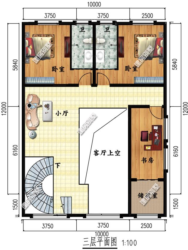 三層高度3.2米,布局為2臥室+2衛(wèi)、小廳、書房、儲(chǔ)藏室。