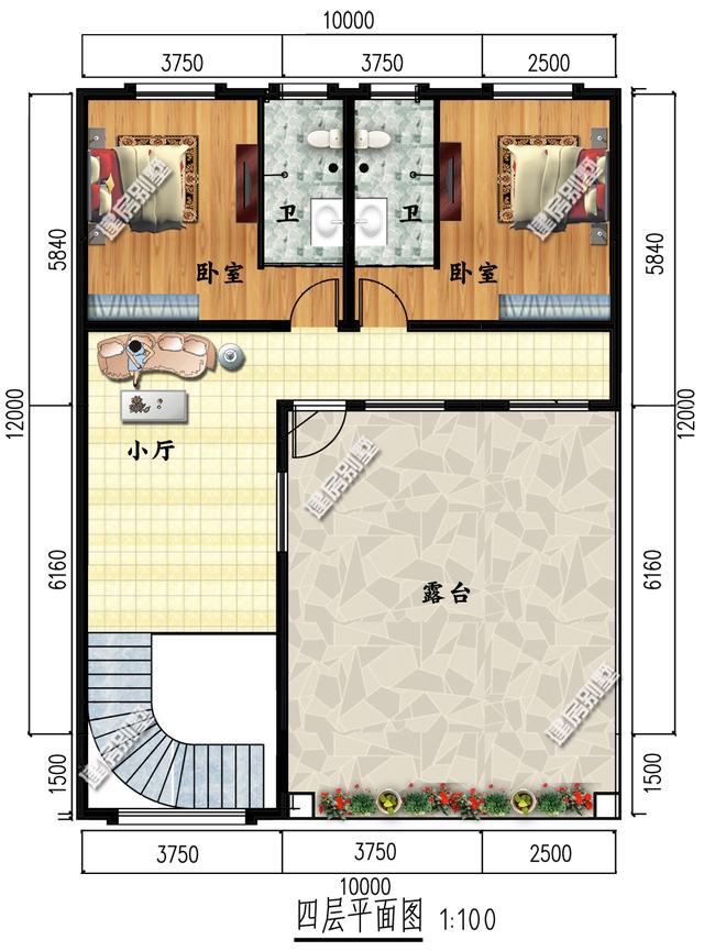 四層高度3.2米,布局為2臥室、2衛(wèi)、小廳、露臺(tái)。