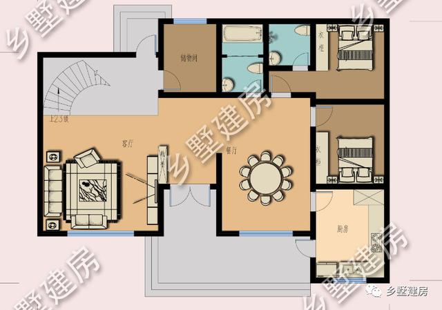 一層設(shè)計(jì)了客廳、玄關(guān)、餐廳、廚房、兩間臥室、公衛(wèi)、儲(chǔ)物間。客廳為挑空設(shè)計(jì),設(shè)計(jì)在左側(cè),南面是兩層落地大窗,實(shí)用性和美觀性都很高。廚房設(shè)計(jì)在右下角,并且留有小門,方便進(jìn)出。右上兩間臥室,一間老人房,一間客房,老人房帶獨(dú)衛(wèi),衛(wèi)生方便。