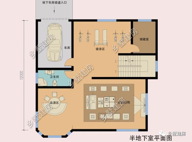地下室設計了一個車庫,入庫門設計在后方。此外設計了健身區(qū)、品酒區(qū)、家庭影院區(qū)、儲藏室、公衛(wèi)??梢钥闯鰜淼叵率业脑O計基本是為了滿足主人的娛樂需要,這樣足不出戶也能享受很多娛樂生活。