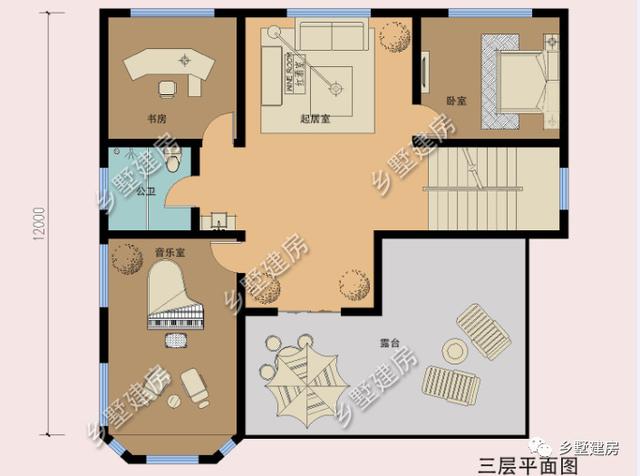 三層設計了臥室、書房、音樂室、起居室、公衛(wèi)以及一個大露臺。書房方便主人學習辦公,音樂室的設計有利于陶冶主人的情操,也利于孩子的興趣培養(yǎng)。露臺的好處更是不用多說,夏天的夜晚在這喝茶休息,也是生活的樂趣。