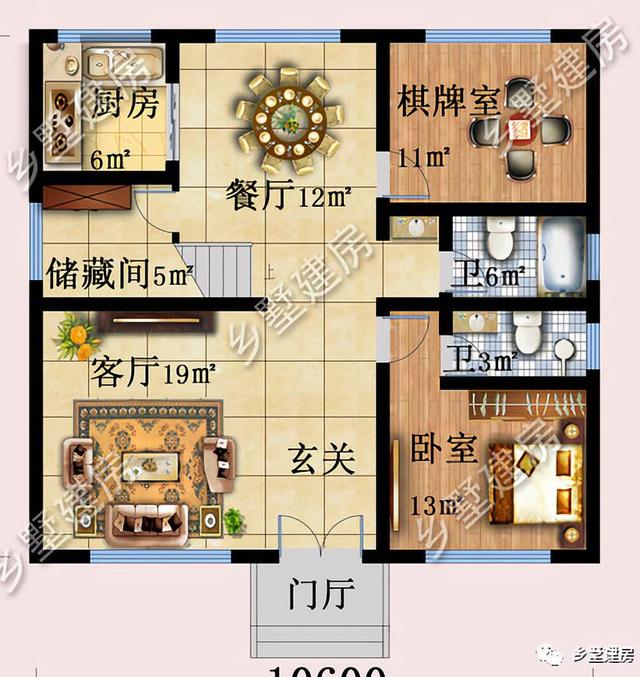 一樓門(mén)廳進(jìn)去之后是玄關(guān),右邊是一件帶私衛(wèi)的臥室,可以作老人房。平時(shí)也不用爬樓梯。玄關(guān)進(jìn)去之后就是餐廳和廚房緊挨在一起,炒完菜后可以直接端上桌子。餐廳的右手邊就是一件棋牌室和公衛(wèi),可作為平時(shí)的休閑娛樂(lè)使用。一樓的左邊是一個(gè)挑空客廳和一個(gè)儲(chǔ)藏間。