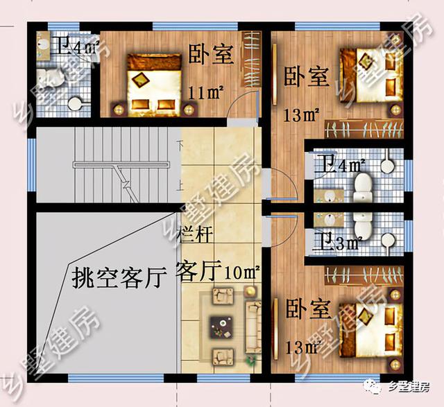 二樓可以作為住戶(hù)的居住區(qū),共有三間臥室都帶有獨(dú)立衛(wèi)生間。樓梯上來(lái)就是挑空客廳的上層,所以二樓的通風(fēng)和采光也是非常好的。挑空客廳的上層設(shè)有欄桿,提高了住戶(hù)的安全性,往里走就是一個(gè)客廳。