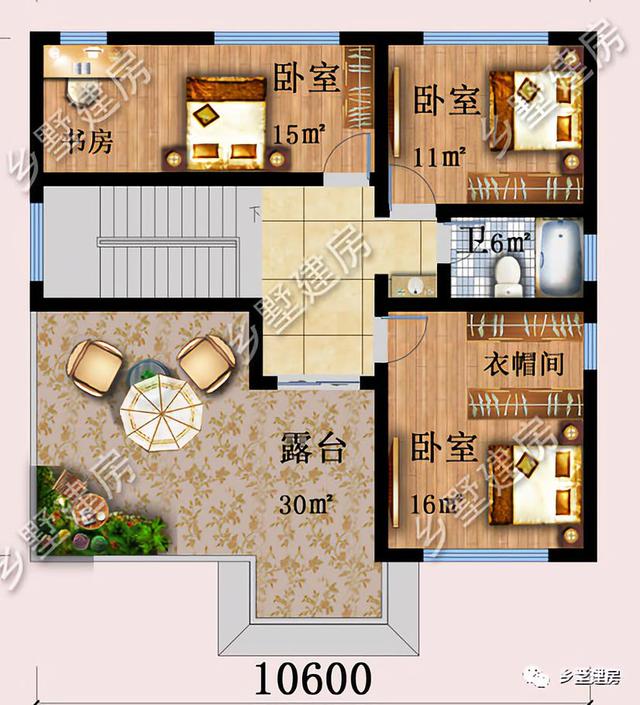 三樓朝南方向是一間帶衣帽間的臥室,女住戶(hù)的衣服可以置放在這里,還有一個(gè)30平方米的露臺(tái)。可以擺放個(gè)桌子或者種植點(diǎn)花草。還有倆間臥室在北面,一間帶有書(shū)房。樓梯上來(lái)處就是一個(gè)公衛(wèi),非常的方便。