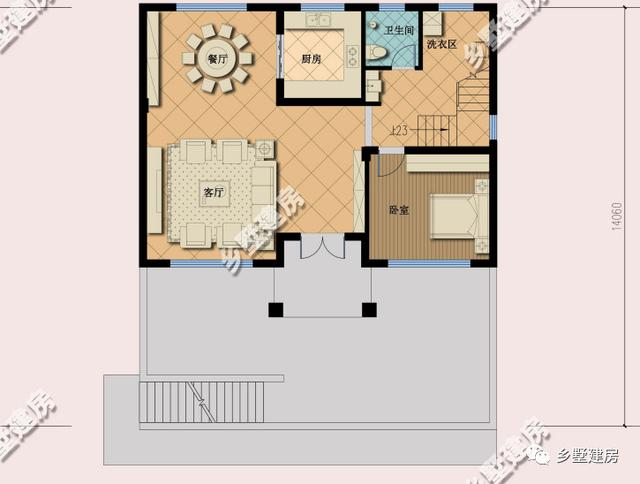 樓梯上去還可以作為一個小院子利用起來,可以放置些盆栽或者有一些住戶可以養(yǎng)一只心愛的寵物狗。甚至是擺放一張小桌子都是沒有問題的。那么進門之后,右邊是一個臥室。左邊就是客廳,客廳邊上同時是餐廳和廚房,這樣子的話,燒好的飯菜就可以立馬端上桌子。右邊是一個公衛(wèi)和洗衣區(qū)。二層還有個直接從一層直通的樓梯,便于雨天使用。