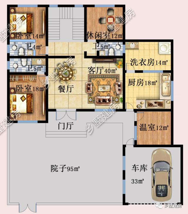 正門進(jìn)去是一個(gè)95平的院子,車庫設(shè)在院子?xùn)|邊,車庫中有小門可直接進(jìn)入院子。院子邊還設(shè)計(jì)有一個(gè)小溫室,喜歡養(yǎng)花的朋友可以養(yǎng)點(diǎn)花花草草,或者可以種點(diǎn)蔬菜。一樓設(shè)有兩間臥室,都是套房,方便家中老人起居,另設(shè)有休閑室,休閑娛樂打牌不愁沒地兒,休閑室邊設(shè)有一個(gè)公共衛(wèi)生間。廚房北邊設(shè)有洗衣房,清洗衣物十分方便,餐廳和客廳是連通設(shè)計(jì)。
