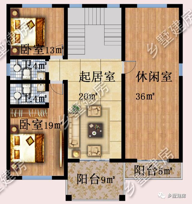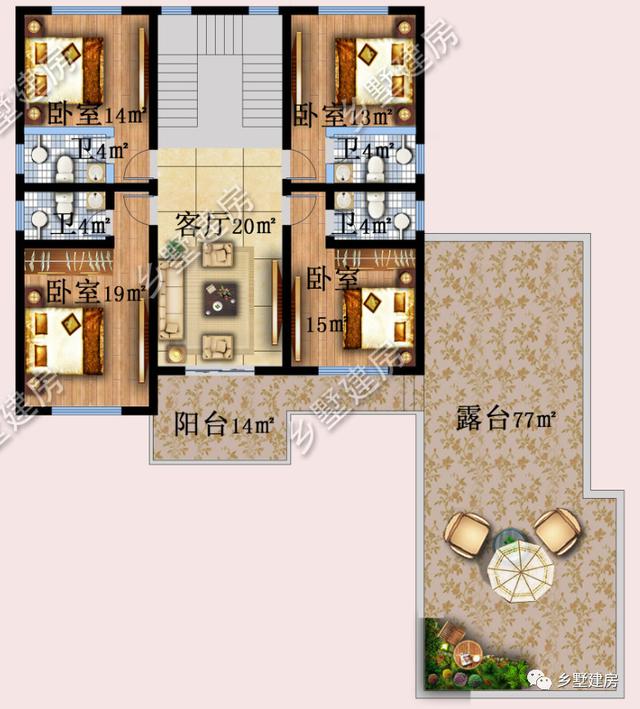 二樓設(shè)有四個(gè)套間以及一個(gè)小客廳,客廳南邊配有一個(gè)小陽臺(tái),保證采光充足。東邊設(shè)計(jì)成77平超大露臺(tái),露臺(tái)上可以擺些桌椅,天氣好時(shí)夏天的晚上可以在露臺(tái)上吹吹風(fēng),看看星空夜景,別有一番意境。