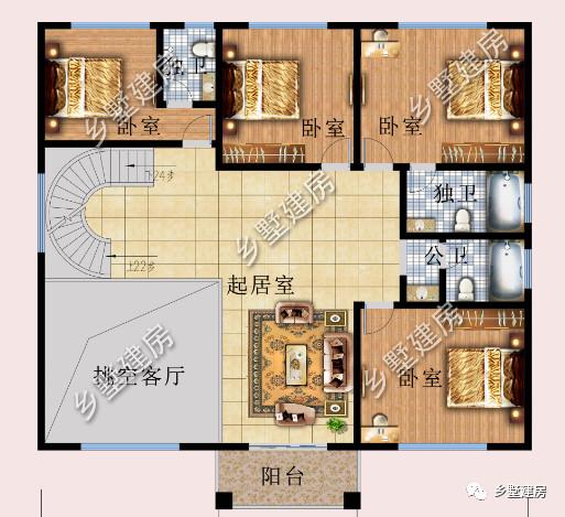 二層是主要的居住區(qū),設(shè)有四間臥室,一個(gè)起居室,兩間主臥都是套房設(shè)計(jì),起居室南邊有一個(gè)小陽臺(tái),保證采光。