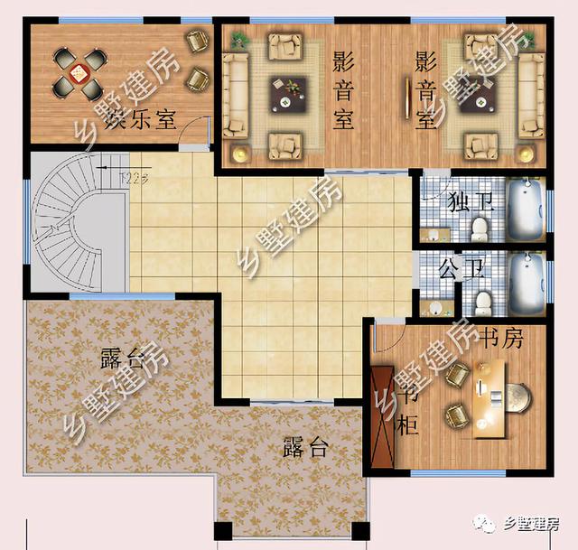 三層為休閑區(qū),設(shè)有一間書房,一個(gè)娛樂室和兩個(gè)影音室,還有一個(gè)大露臺(tái)。娛樂室是為喜歡打牌的人設(shè)計(jì)的,農(nóng)村過年時(shí)候走親訪友都喜歡打打牌娛樂一下,娛樂室自然是少不了的。影音室是專門為喜歡看電影的人設(shè)計(jì)的,再也不用跑到電影院去看電影了,在家一樣能享受到私人影院的待遇,影音室還帶一個(gè)獨(dú)立衛(wèi)生間,十分方便。