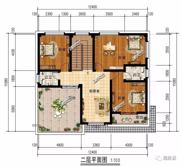 二層:設(shè)有3間臥室,主次分明;露臺和陽臺可以提供晾曬,保證采光充足。