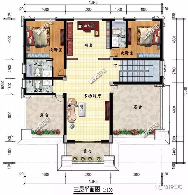 三層布局說(shuō)明:兩室一廳三衛(wèi),室外設(shè)計(jì)雙露臺(tái),觀景和晾曬兩不誤。