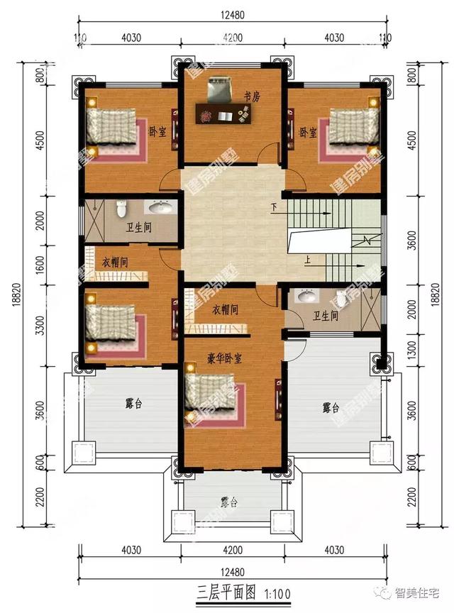三層布局圖:共設(shè)有四間臥室,其中主臥室內(nèi)配衣帽間、獨衛(wèi)和連著觀景露臺,另一臥室也配衣帽間、獨衛(wèi)和露臺,還有兩個次臥室和書房。
