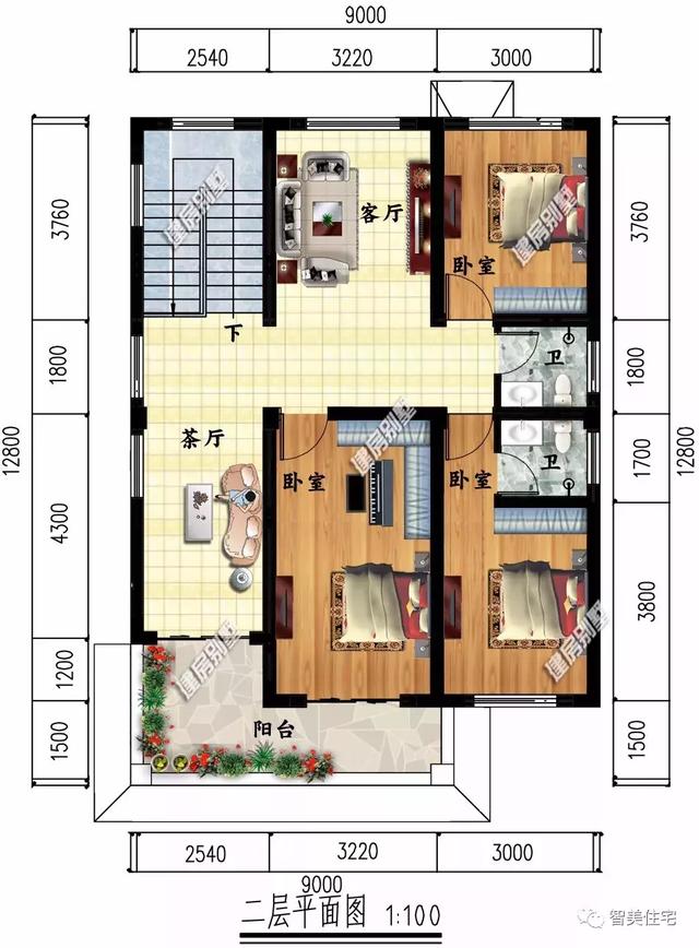 戶型一:9×12.8米,建在安徽的一棟小別墅,占地面積111平方米,磚混結(jié)構(gòu),別墅的外墻面主要用文化石和真石漆裝飾,一層設有門廊,二層設有走廊陽臺,造型豐富。