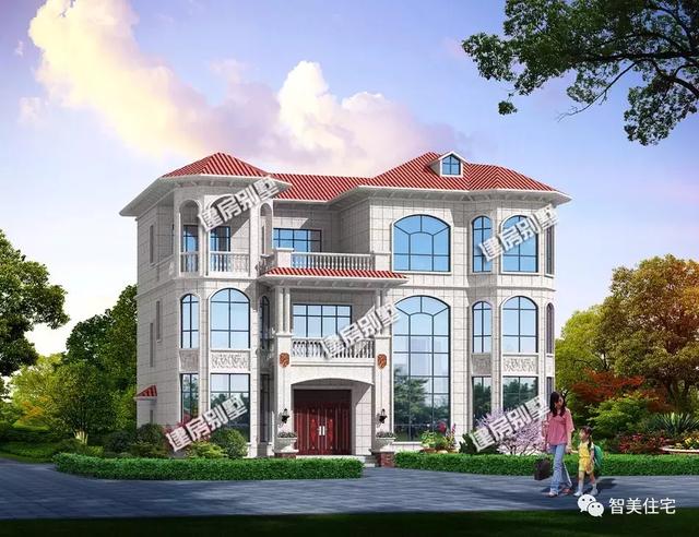 第二棟:13.6×17米,磚混結(jié)構(gòu),主體造價45-50萬左右,外觀造型同樣很美觀和豪華,主要用黃色真石漆和構(gòu)件裝飾,配有落地大窗,很氣派且室內(nèi)采光很好,屋面開有兩扇老虎窗,且用紅色琉璃瓦裝飾。