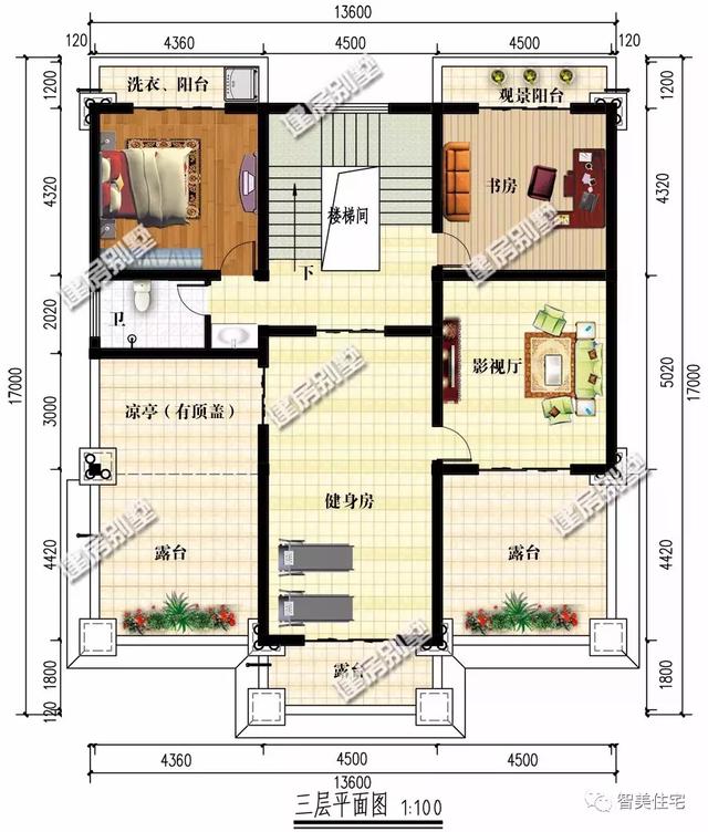 平面圖:一層入戶處配有單獨(dú)的堂屋,一間帶主衛(wèi)的老人房和一間次臥室,客廳挑空設(shè)計(jì),南北通透;二層設(shè)有三間臥室,配有室內(nèi)休閑空間,室外設(shè)有多陽臺,便于觀景和晾曬;三層設(shè)有一間臥室,配有書房和影視廳等,室外設(shè)以觀景露臺空間。