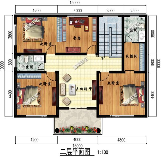 二層高度3.3米,布局為:2次臥室,公衛(wèi),書房,公衛(wèi),多功能廳,主臥室+私衛(wèi)+衣帽間,陽臺。