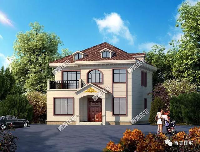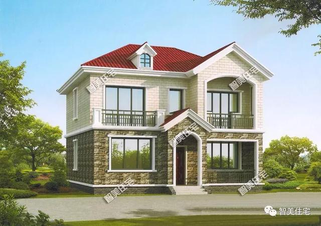 戶型二:10×10米,磚混結(jié)構(gòu),一款面寬和進深尺寸一樣的戶型,外墻面用文化石和白色面磚裝飾,屋面開有一個老虎窗,用紅瓦裝飾。