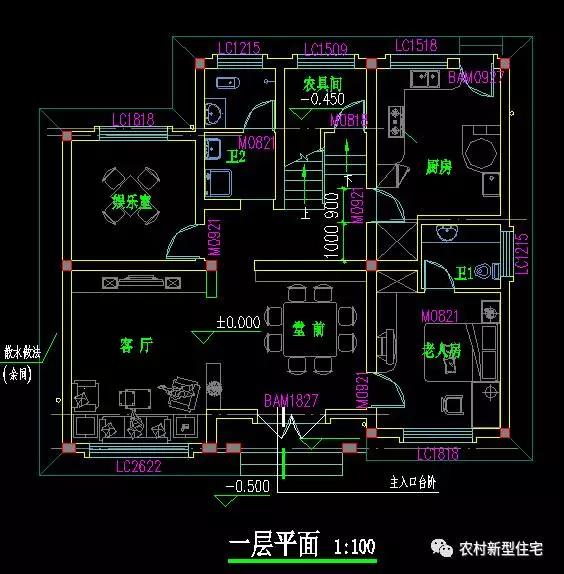 一樓設(shè)有客廳、農(nóng)具間、娛樂室、餐廳、廚房、衛(wèi)生間和老人房;