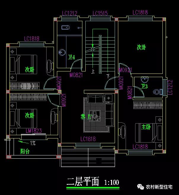 二樓設(shè)有主臥、三間次臥室、2個(gè)衛(wèi)生間、客廳和陽臺(tái);