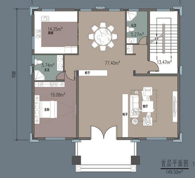 一層:玄關(guān)、客廳、主臥(帶主衛(wèi))、餐廳、廚房、公衛(wèi)