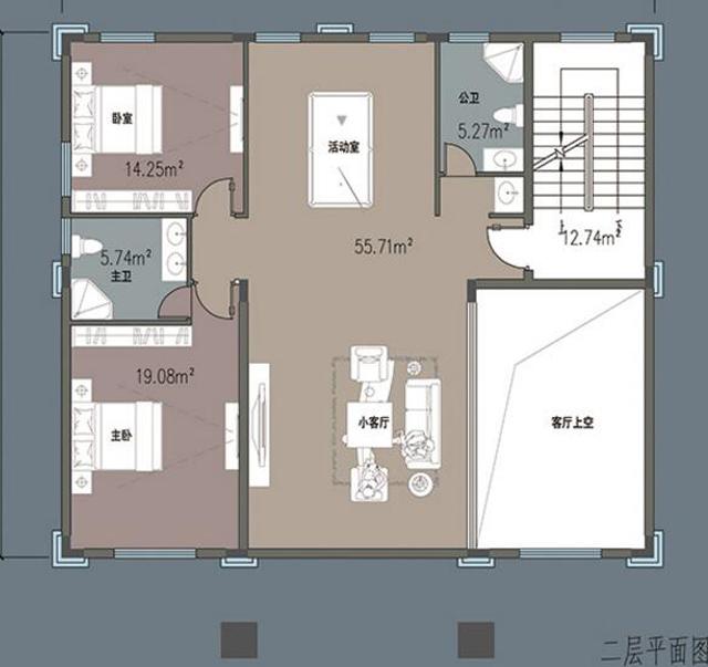 二層:客廳上空、小客廳、活動室、主臥(帶主衛(wèi))、臥室、公衛(wèi)