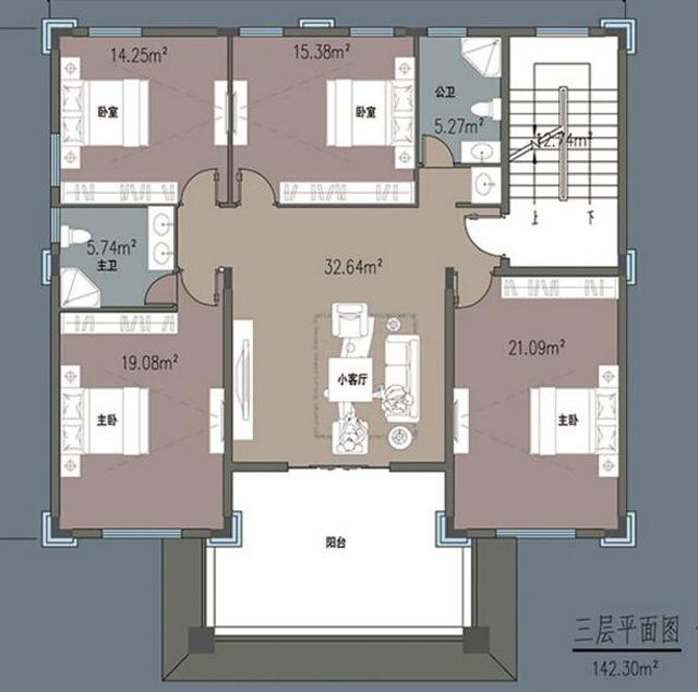 三層:小客廳(帶陽臺)、主臥(帶主衛(wèi))、3臥室、公衛(wèi)