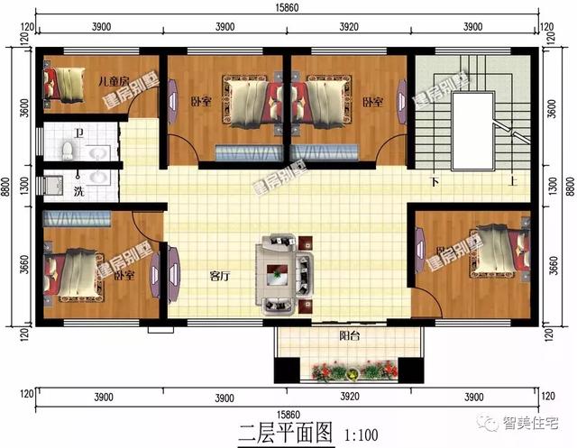 平面圖:一層設有三室兩廳一廚一衛(wèi),一個比較的房間用做兒童房,也可以拿出一間做休閑娛樂室,具體布置是根據(jù)家里的需要來的;二層設有五室一廳一衛(wèi),臥室多,配寬敞的家庭客廳,室外設陽臺用于晾曬;三層設有四間臥室備用,室外配觀景露臺。