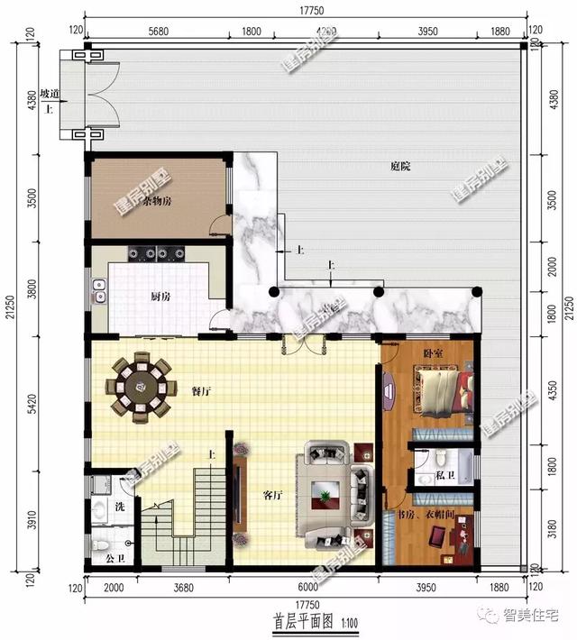 中式別墅:17.75×21.25米,L型設計的,并配上中式的院子,復古的味道很濃,外墻面簡單的白色調裝飾,屋面配青瓦,羅馬柱和護欄都是用棕紅色漆裝飾。