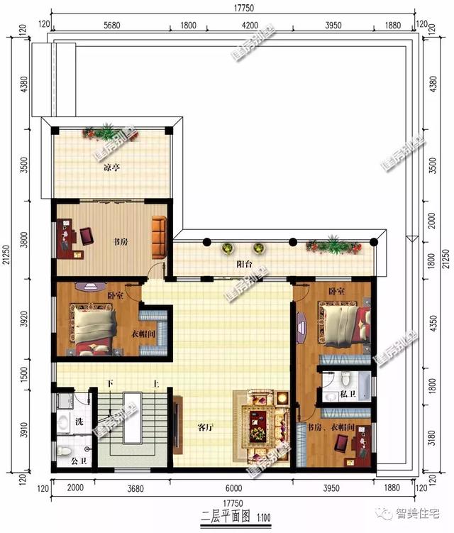 平面圖:一層設有一室兩廳一廚兩衛(wèi),一間主臥室內配獨衛(wèi)和衣帽間(書房),設有寬敞的客廳可做堂屋用,廚房和雜物間正好位于L型的另一個部位,內庭院可在主體完工后進行很好的規(guī)劃;二層和三層的布局是一樣的,每層都設有一間主臥、一間次臥室,書房、陽臺和露臺等。
