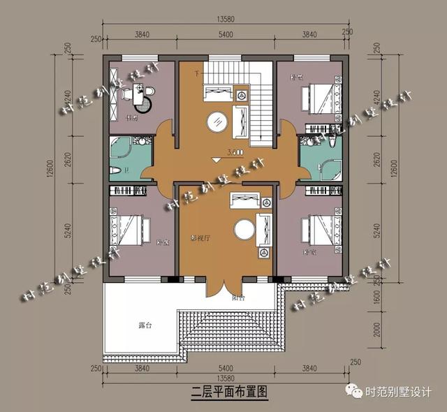 二層設(shè)四間臥室、兩間衛(wèi)生間、一個陽臺,一個大露臺。