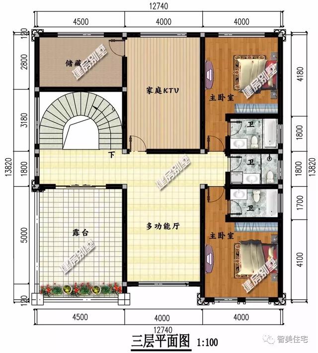戶型二:12.74×15.32米,占地面積183平方米,建筑面積502.82平方米,磚混結(jié)構(gòu),主體造價(jià)48萬左右,外墻面配落地窗,用 米黃色真石漆裝飾,屋面配紅瓦。