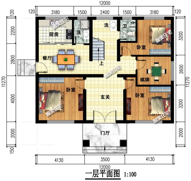 一層高度3.5米,布局為:3臥室,廚房,餐廳,公衛(wèi),棋牌,洗衣房。一層基本上是兩兄弟和父母公用的空間,還可以用來日常的招待親戚朋友,布局相對(duì)來說比較的緊湊。